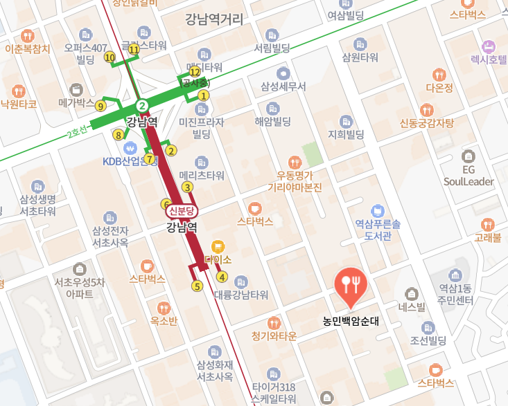 강남역에서 300m로 상당히 가까운 위치에 있습니다. 강남역에도 다양한 메뉴와 식당들이 많지만 그중에도 순대국밥은 농민 백암순대가 제일인 것 같습니다. 금액도 그렇게 비싸지 않으며, 순대는 일반 찰순대가 아닌 토종 순대로 순대 하나를 먹어도 맛이 상당히 좋습니다.