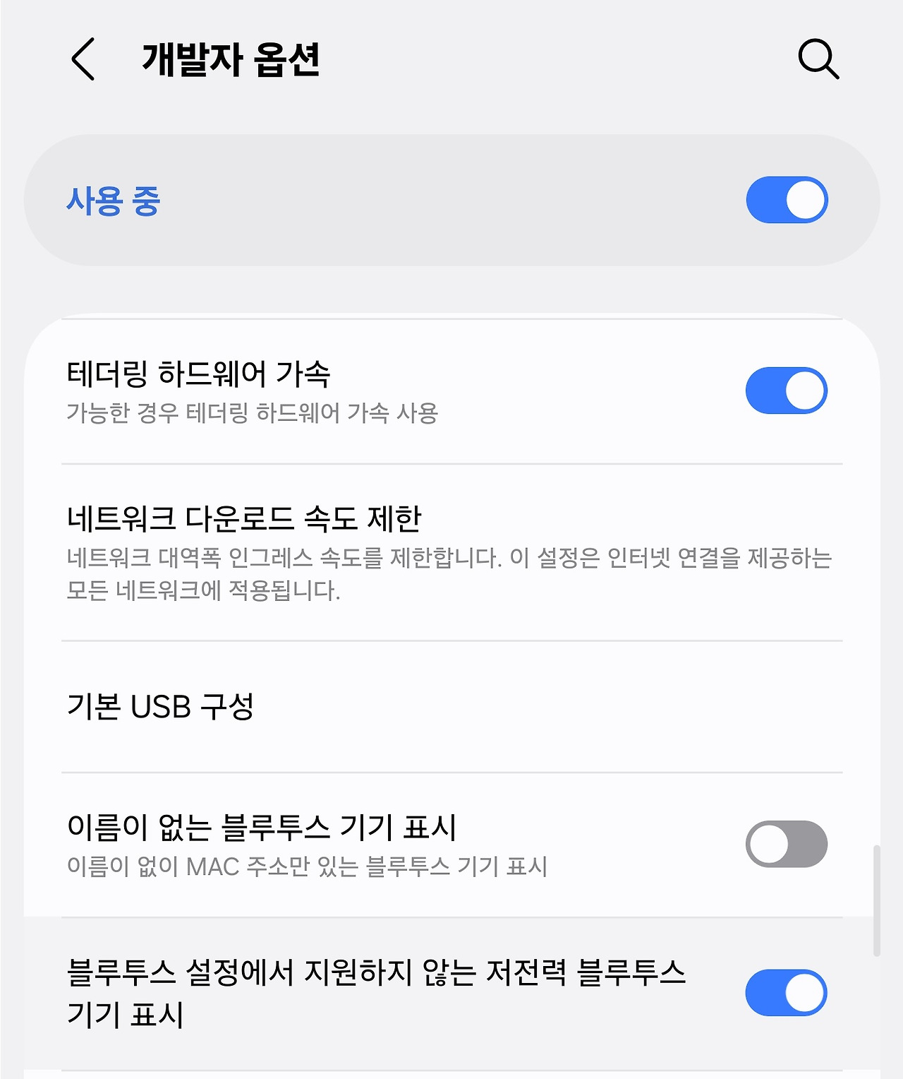 2. 다시 설정으로 나와 개발자 옵션으로 들어갑니다. 개발자옵션에서 쭉 내리면 "블루투스 설정에서 지원하지 않는 저전력 블루투스 기기 표시" 라는 것이 있는데 이것을 활성화 해 주면 블루투스 기기가 다른 기기와 마찬가지로 정상적으로 검색이 되는 모습을 볼 수 있었습니다.