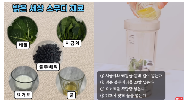 시금치와 케일을 잘게 썰어 넣고 냉동 블루베리 그리고 요거트와 꿀을 같이 믹서기에서 갈아줍니다. 이렇게 매일 갈아 드시면서 달걀도 같이 섭취하시면, 눈에도 더 좋은 식품들을 섭취하실 수 있습니다. 배도 채우고 눈 건강도 챙기면서 눈에 좋은 여러가지 음식을 섭취하시면 좋겠습니다.