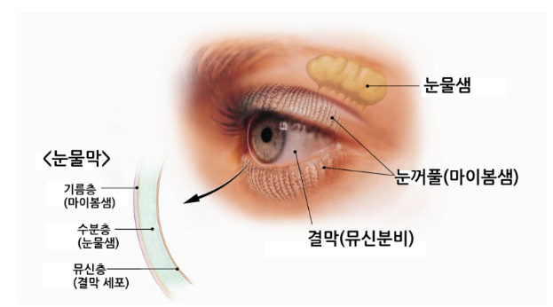 우리 눈에 눈물층은 물로만 이루어져 있지 않고, 가장 밑에 점액층, 가운데 물층, 그리고 바깥으로는 지방층으로 구성되어 있습니다. 지방은 눈꺼풀 안쪽에 일종의 피지샘이며 마이봄샘으로부터 지방이 분비가 돼서 형성되어 있습니다.