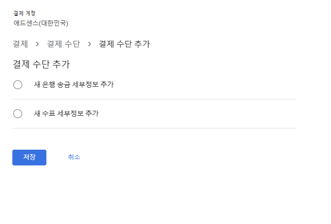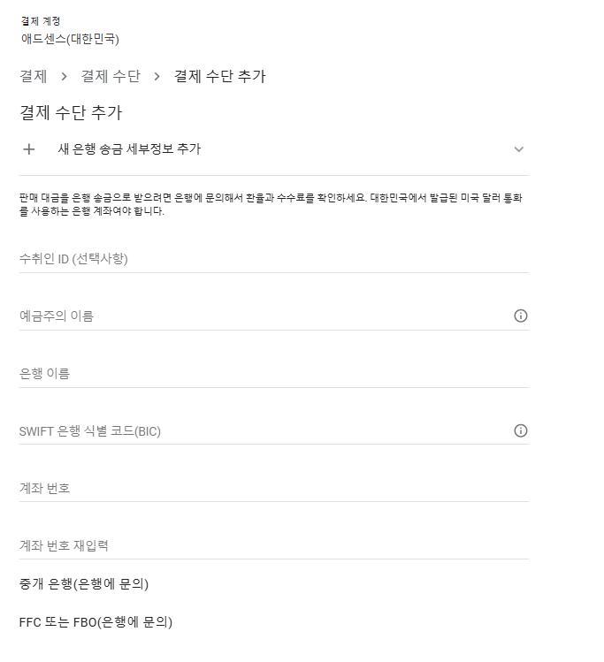새 은행 송금 세부정보 추가 혹은 새 수표 세부정보 추가를 클릭하여, 정보를 입력하면 됩니다. 수표보다는 새 은행 송금 세부정보 추가를 통해서, 은행 정보를 등록하여 결제 수단을 등록하는 것을 추천드립니다.