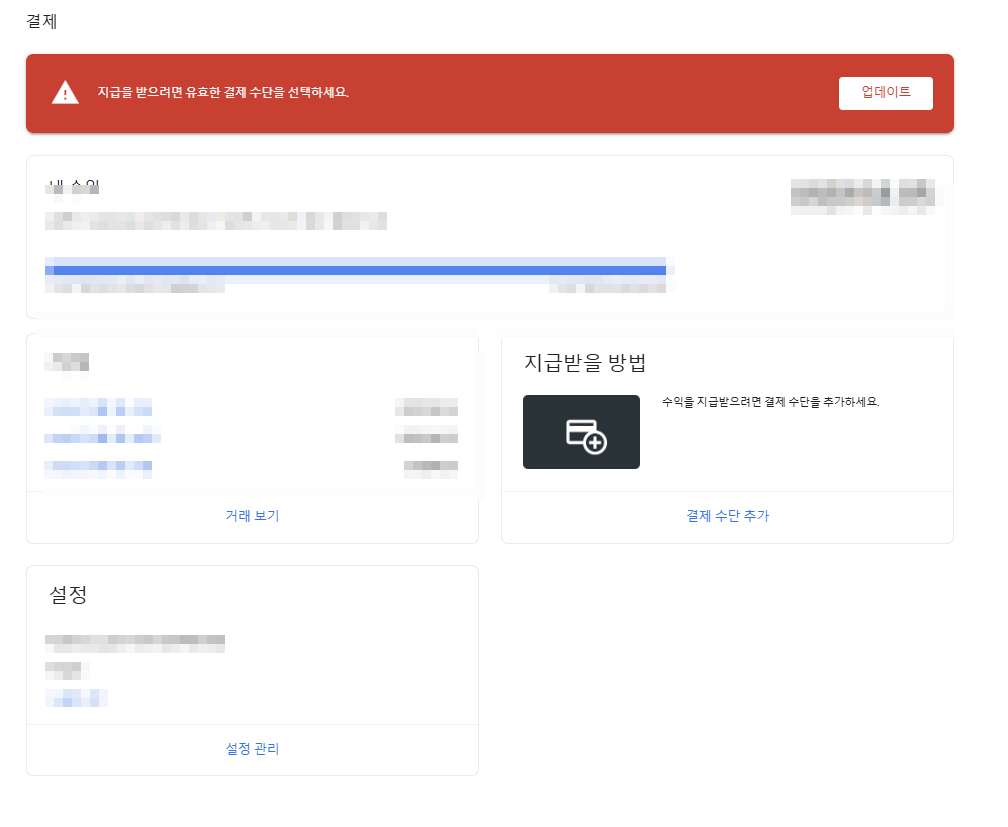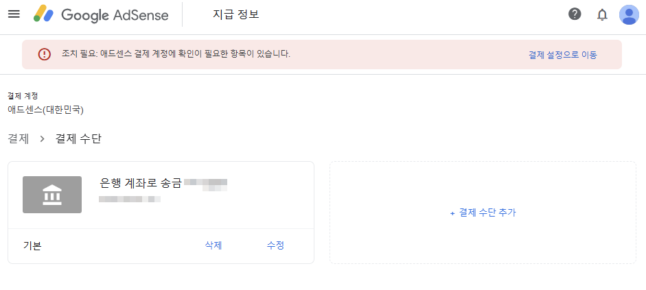 저장을 클릭하면, 화면이 전환되면서 이렇게 등록된 정보를 확인할 수 있습니다. 이로서 구글 애드센스 결제 수단 등록하는 방법이 완료되었습니다. 오늘도 방문해 주셔서 감사합니다. 좋은 하루 보내세요.