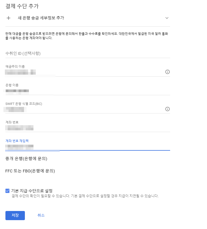 새 은행 송금 세부정보 추가 혹은 새 수표 세부정보 추가를 클릭하여, 정보를 입력하면 됩니다. 수표보다는 새 은행 송금 세부정보 추가를 통해서, 은행 정보를 등록하여 결제 수단을 등록하는 것을 추천드립니다.