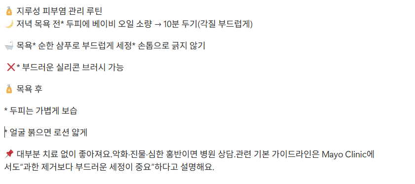 🧴 지루성 피부염 관리 루틴 🌙 저녁 목욕 전* 두피에 베이비 오일 소량 → 10분 두기(각질 부드럽게)