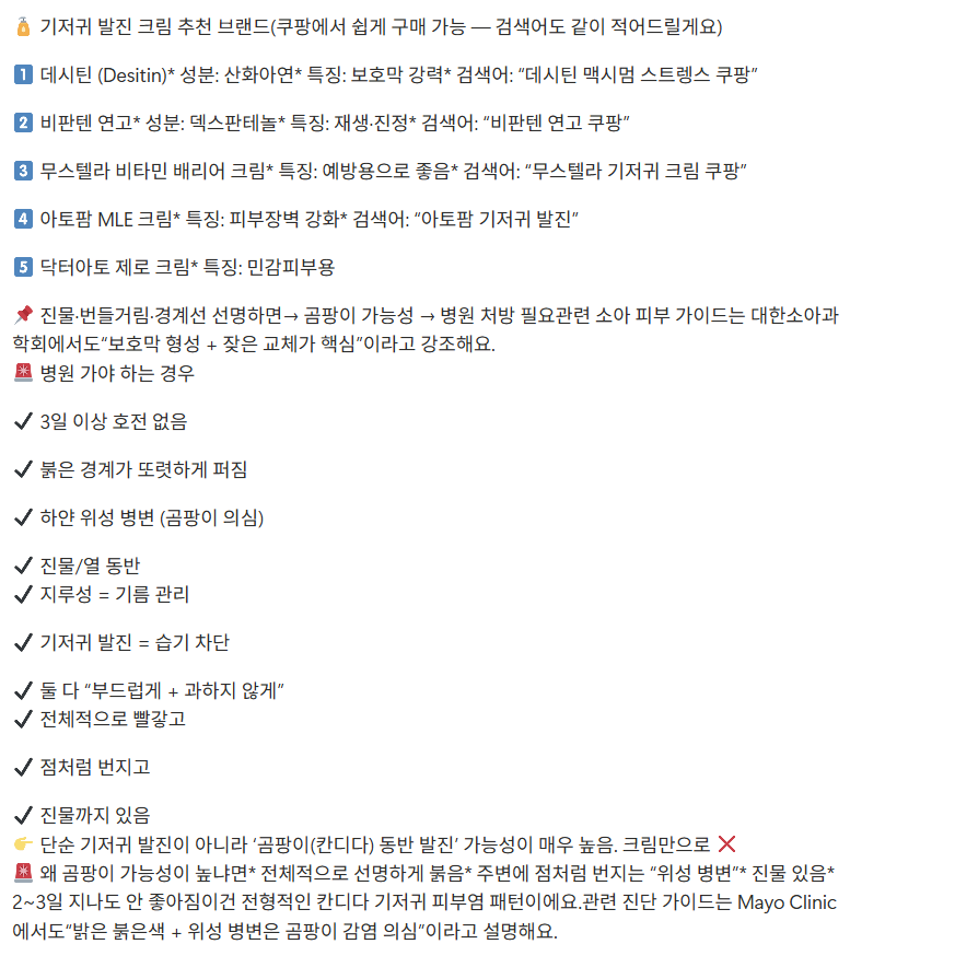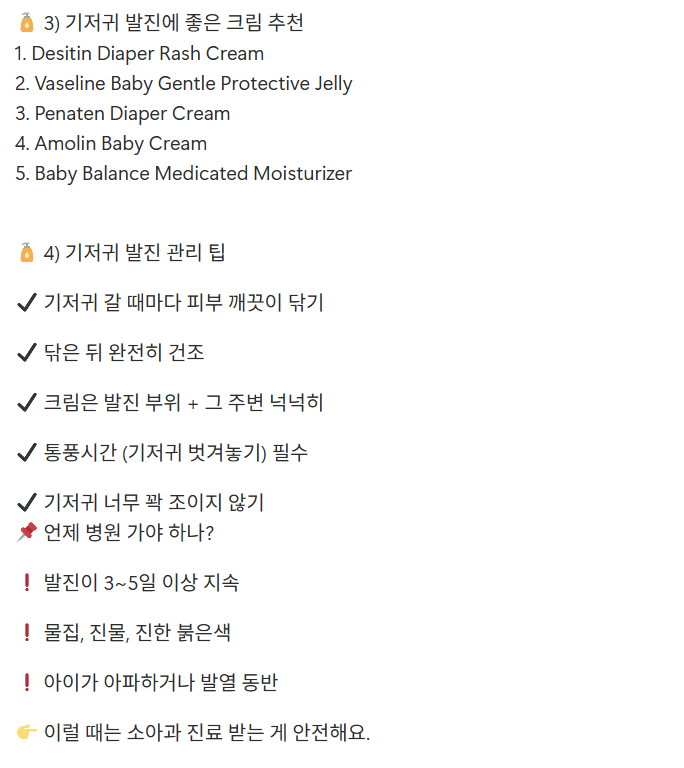 2️⃣ 오늘부터 응급 관리 루틴🕒 기저귀 갈 때마다* 물로 씻기 (물티슈 최소화)* 완전 건조 (수건 + 자연건조 1~2분)* 보호막 크림 두껍게 (산화아연) 🧴 당장 사용할 수 있는 보호막 크림아래는 쿠팡에서 많이 쓰는 제품들이에요
