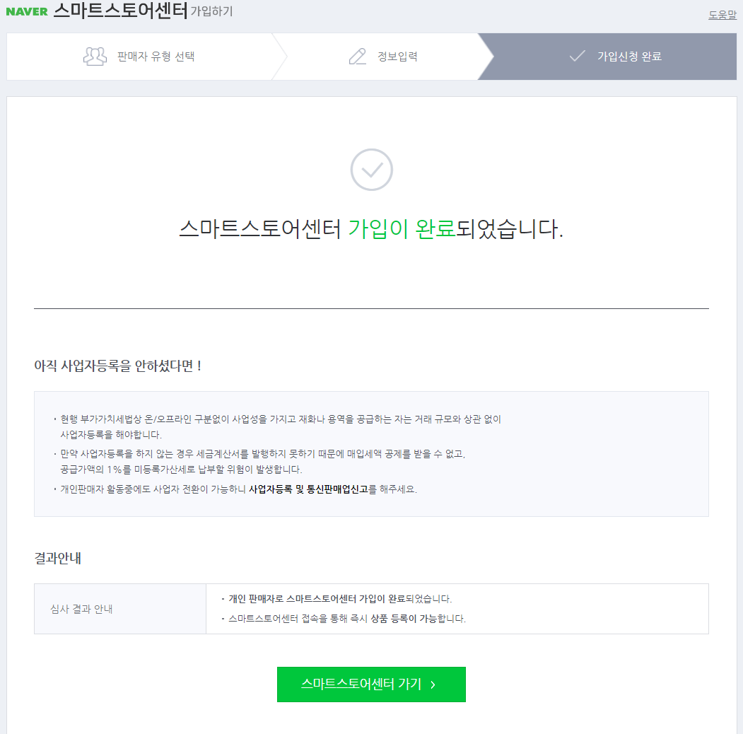 이렇게 개인정보를 입력하게 되면, 스마트스토어 가입을 위한 정보입력 부분도 끝이 납니다.