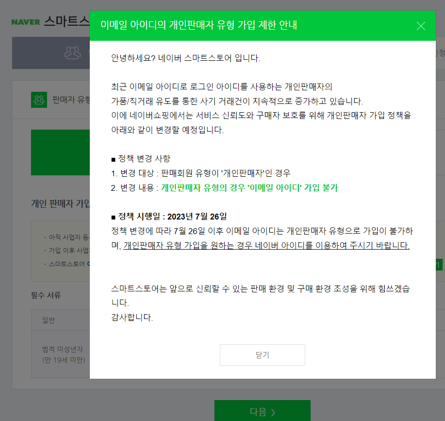 요즘 이메일 아이디로 로그인하여 상품을 판매하는 개인판매자들 중, 가품/직거래 사기가 급증한다고 합니다. 따라서 네이버에서는 이를 예방하고 보안하고자 2023년 07월 26일 이후의 가입자부터는 개인판매자 유형의 경우 '이메일 아이디'를 통한 가입은 불가하다고 합니다. 따라서 이메일 아이디를 통해 가입을 희망하고자 하는 분들은 2023년 07월 26일 도래하기 전에 서둘러 스마트스토어 계정을 발급하시면 좋겠습니다.