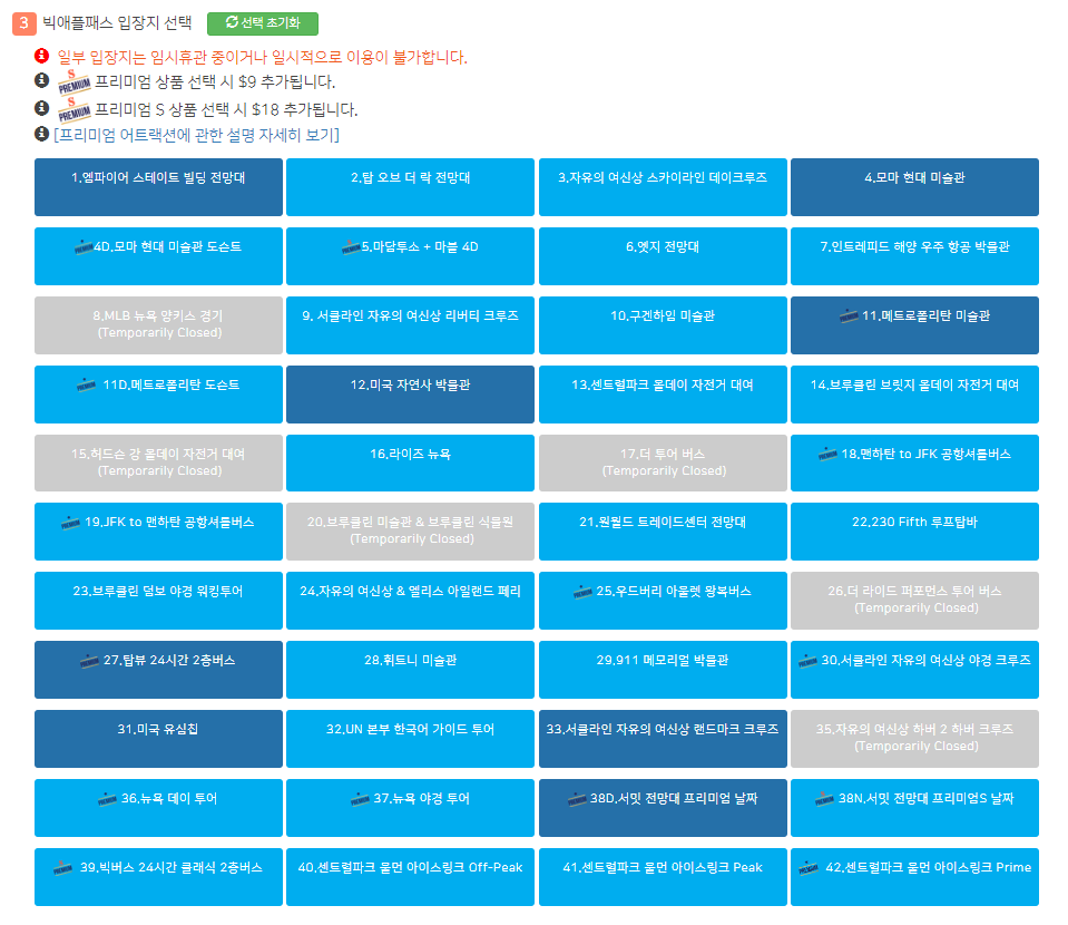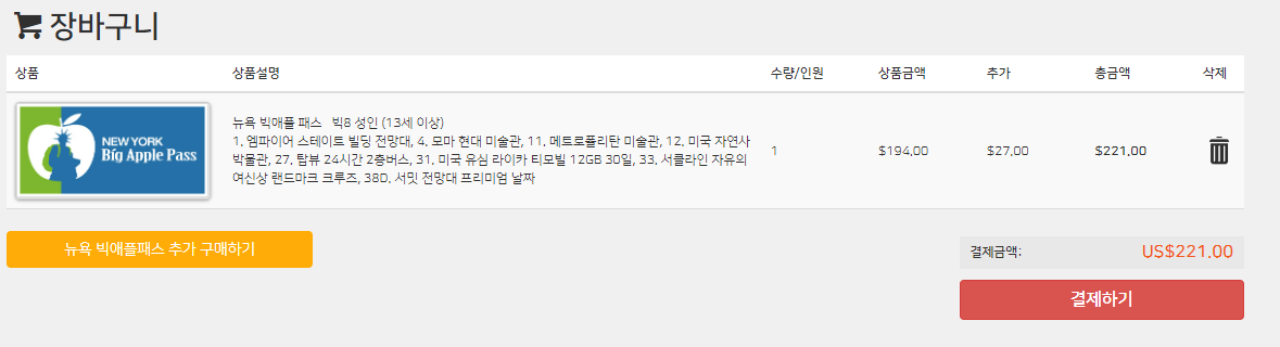 일주일간의 뉴욕 여행에 필요한 패스를 아래와 같이 빅8 애플패스로 구매했습니다.