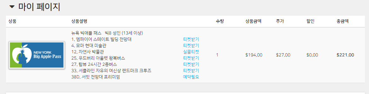 또한 빅애플패스의 장점은 티켓을 이메일로 미리 받을 수 있다는 것이라서, 여행을 준비하시는 분들은 출력해서 준비도 할 수 있습니다.