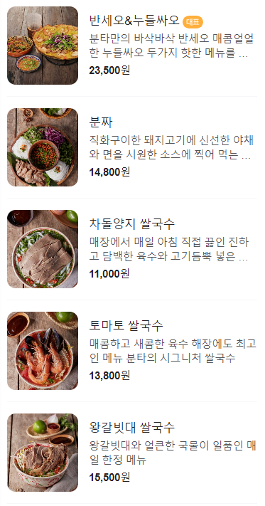 저는 분타 일원점에 방문하여 토마토 쌀국수, 소고기 볶음면, 짜조를 주문했습니다. 토마토 쌀국수에는 큼직한 새우가 들어가서 현지에서 먹는 것과 같은 느낌이 났습니다. 소고기 볶으면은 너무 짜지 않고 너무 달지도 않아서 간단하게 먹기에 아주 좋았습니다. 짜조도 육즙이 가득해서 사이드 메뉴로 같이 시키기에 좋을 것 같습니다.