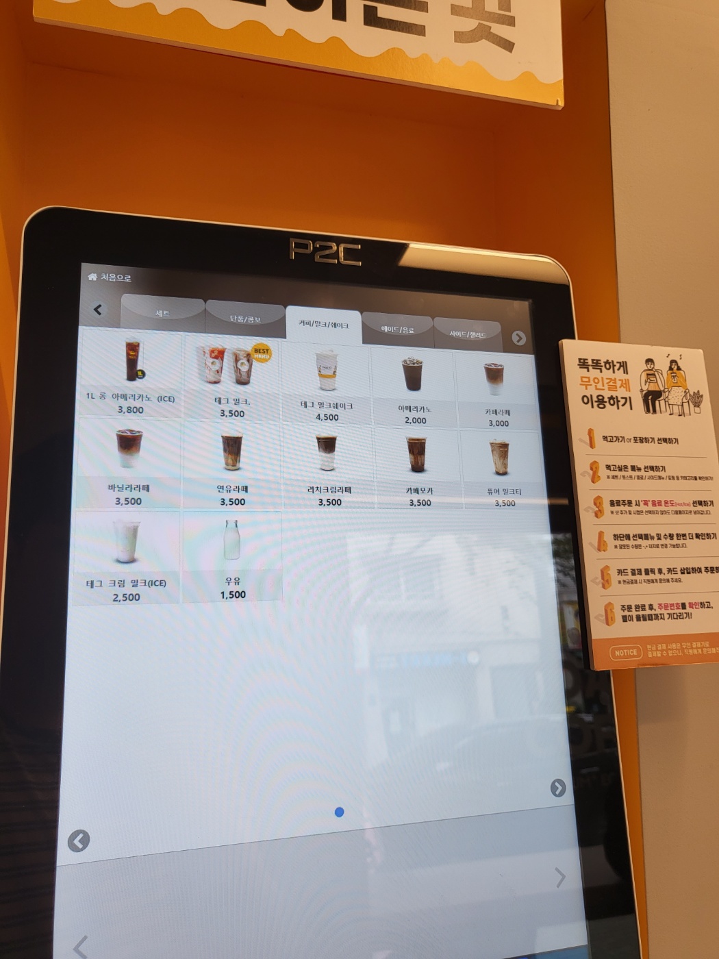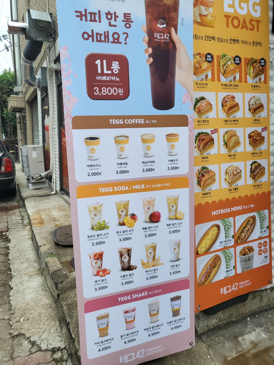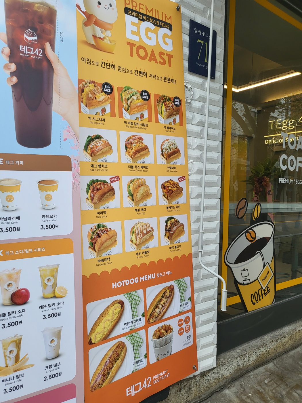 최근에 개업해어 매장이 상당히 깔끔합니다. 커피도 팔고 있어서, 토스트와 함께 즐기기에도 좋을 것 같습니다. 커피 종류로는 아이스아메리카노와 같이 카페라테, 바닐라라테, 카페모카를 팔고 있습니다. 테그 소다 및 밀크 시리즈 종류라고 해서는 청포도 밀키 소다, 망고 밀키 소다, 애플 밀키 소다, 레몬 밀키 소다, 딸기 밀크, 초콜릿 밀크, 바나나 밀크, 크림 밀크를 팔고 있습니다. 테그 쉐이크로는 커피 밀크쉐이크, 딸기 밀크쉐이크, 바닐라 밀크쉐이크, 초콜릿 밀크쉐이크를 팔고 있습니다. 음료 외에도 핫도그 메뉴로 명란 에그마요, 비프 칠리, 아미레칸 핫도그도 팔고 있으며 아이들이 좋아하는 콜팝메뉴도 있습니다. 다양한 음료 메뉴와 우유를 활용한 이색적인 메뉴가 많아서 다양하게 먹어볼 수 있을 것 같습니다.