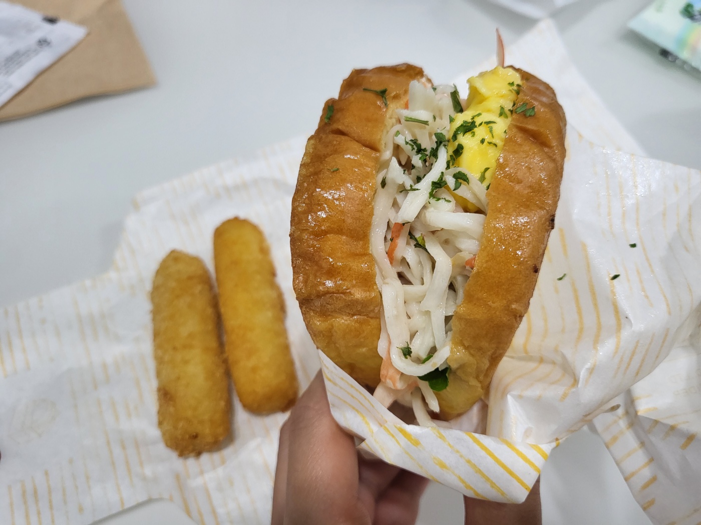제가 주문한 샌드위치는 테그42의 크랩마요 샌드위치였습니다. 샌드위치와 함께 곁들일 치즈시틱도 같이 주문해봤습니다. 테그42의 크랩마요는 한 번도 먹어보지 못한 샌드위치의 맛이라서 새로웠습니다. 달콤한 소스와 부드러운 게살이 어우러져서 샌드위치 하나만 먹어도 상당히 큰 포만감을 느낄 수 있었습니다. 다음에도 주문을 해서 먹고 싶은 정도로 맛이 좋았습니다. 치즈스틱도 간단히 먹기 좋았는데요. 치즈스틱의 맛은 다른 데와 비슷한 것 같아 특별함을 느끼진 못했습니다. 다만 치즈스틱을 좋아하시는 분이라면, 좋아하실 맛이라 같이 추천드립니다.