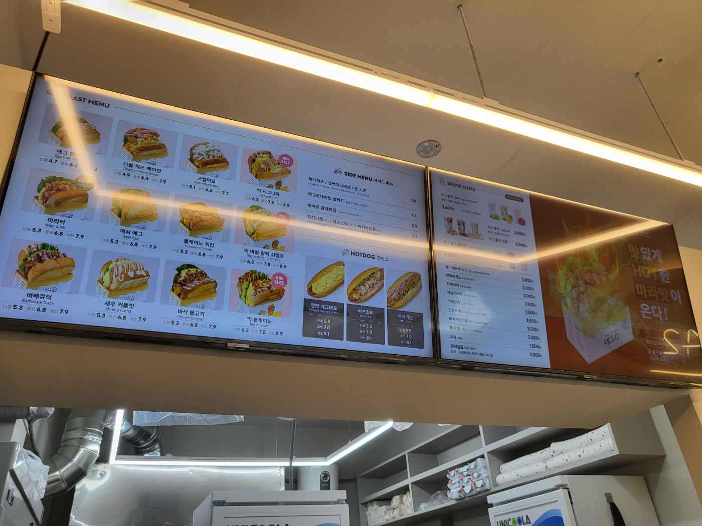 샌드위치 메뉴로는 빅 시그니처, 빅 바질 갈릭 쉬림프, 빅 볼케이노, 에그 햄치즈, 더블 치즈 베이컨, 크랩마요, 마라덕, 해쉬 에그, 볼케이노 치킨, 바베큐덕, 새우 커틀릿, 바삭 불고기 샌드위치를 팔고 있습니다. 종류가 상당히 다양하고 경험해보지 못한 샌드위치가 많아서 먹어보고 싶은 메뉴가 상당히 많습니다. 저는 이번에 크랩마요 샌드위치를 주문해 봤는데요. 사진 및 자세한 후기는 아랫부분에서 좀 더 내용을 작성하도록 하겠습니다. 먼저 테그42의 메뉴를 보시면 좋겠습니다.