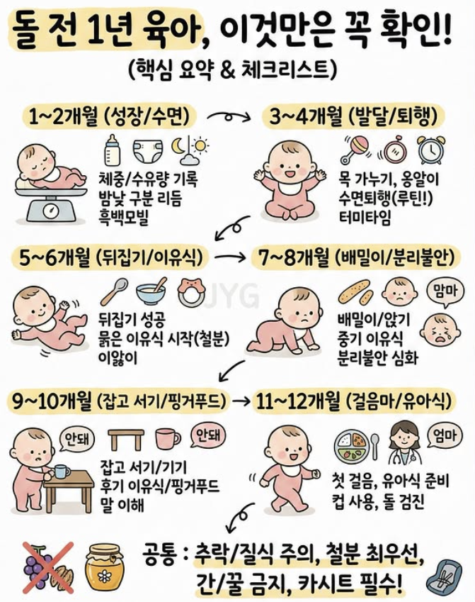 공통 : 추락/질식 주의, 철분 최우선, 간/꿀 금지, 카시트 필수!