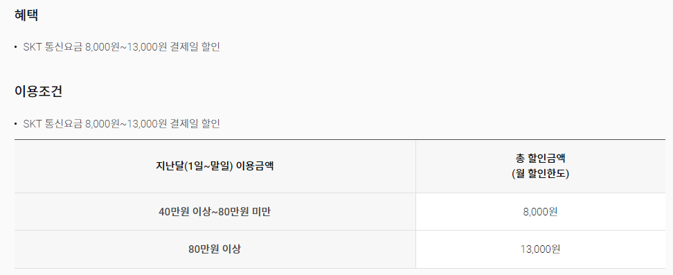 SKT 통신 비 할인은 SKT 통신요금 8,000원~13,000원 결제일 할인이 있습니다. 이용 조건건으로는 40만 원 이상~80만 원 미만 결제 시, 8,000원 할인이 됩니다. 80만원 이상 결제시, 13,000원 할인이 됩니다.