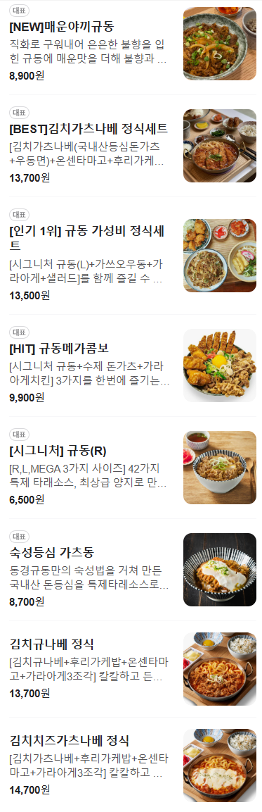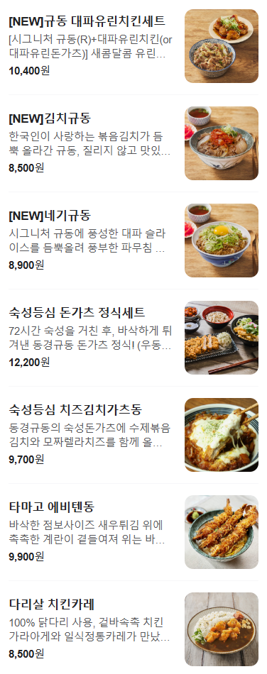 규동 대파유린치킨세트, 김치규동, 네기규동, 숙성등심 돈가츠 정식세트, 숙성등심 치즈김치가츠동, 다마고 에비텐동, 다리살 치킨카레 메뉴도 있습니다.