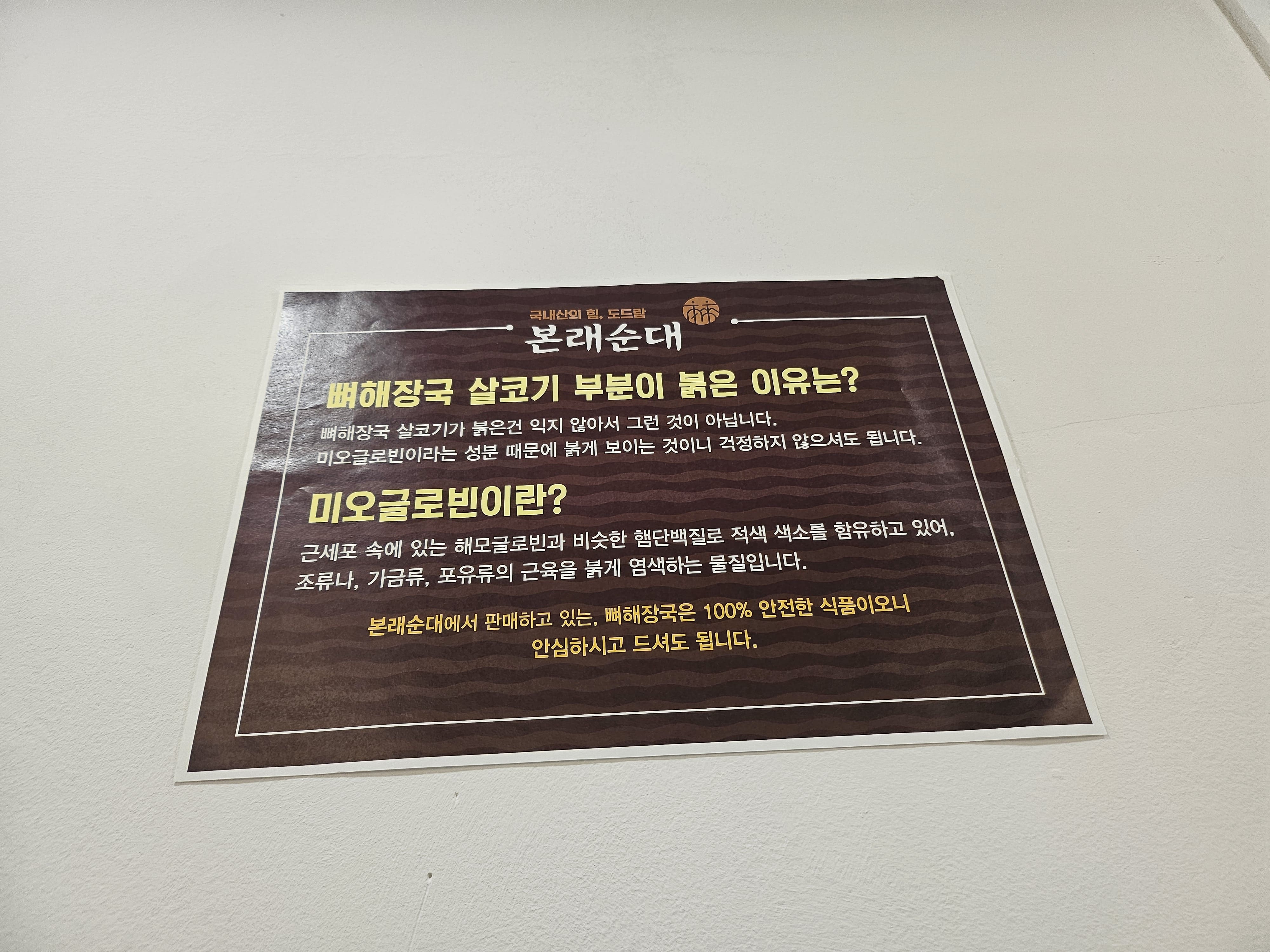 미오글로빈이란, 근세포 속에 있는 해모글로빈과 비슷한 햄단백질로 적색 색소를 함유하고 있습니다. 조류나, 가금류, 포유류의 근육을 붉게 염색하는 물질입니다. 본래순대에서 판매하고 있는 뼈해장국은 100% 안전한 식품이오니 안심하시고 드셔도 됩니다.