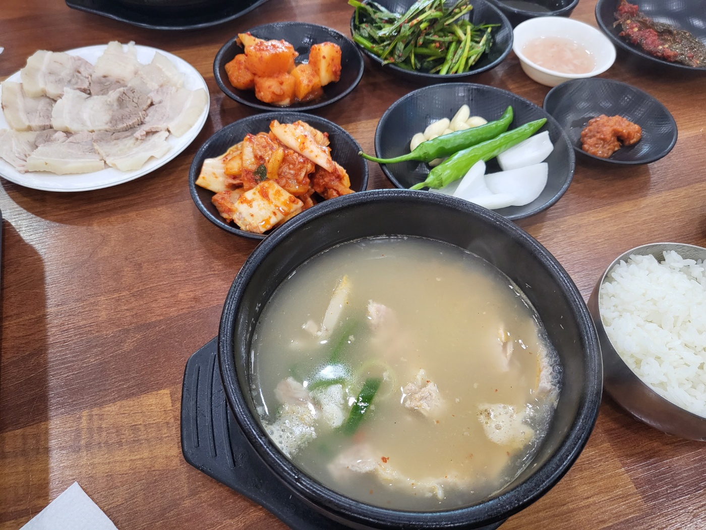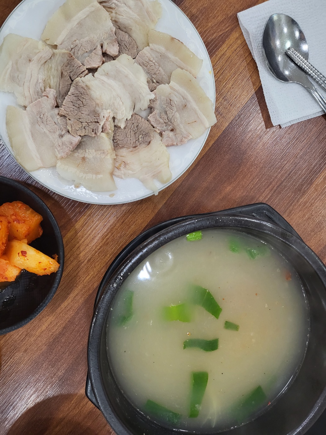 부산 마산식당에서 국밥 2그릇과 편육도 같이 주문하였습니다. 깍두기, 배추김치, 부추, 깻잎 등 반찬이 나오고 사장님이 조리해주신 따뜻한 국밥이 바로 나옵니다. 한 끼 식사로는 양이 충분했으며, 국밥만 시킬 것이 아니라 보쌈 편육도 같이 주문해 보시길 추천드립니다.