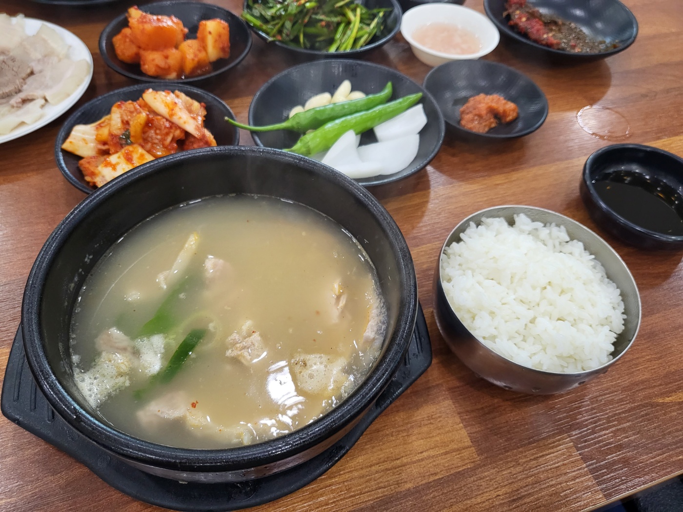 부산 마산식당에서 국밥 2그릇과 편육도 같이 주문하였습니다. 깍두기, 배추김치, 부추, 깻잎 등 반찬이 나오고 사장님이 조리해주신 따뜻한 국밥이 바로 나옵니다. 한 끼 식사로는 양이 충분했으며, 국밥만 시킬 것이 아니라 보쌈 편육도 같이 주문해 보시길 추천드립니다.