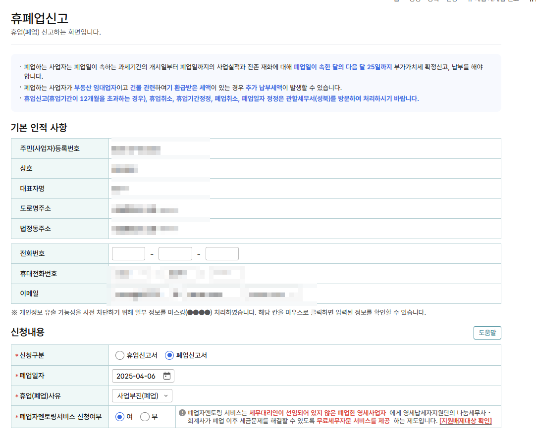 폐업하는 사업자는 폐업일이 속하는 과세기간의 개시일부터 폐업일까지의 사업실적과 잔존재화에 대해 폐업일이 속한 달의 다음 달 25일까지 부가가치세 확정신고, 납부를 해야 합니다.