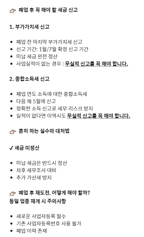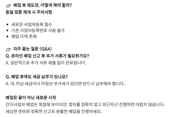 간이사업자 폐업은 복잡해 보이지만, 절차를 정확히 알고 차근차근 진행하면 어렵지 않습니다. 세심한 준비와 정확한 신고로 원활한 폐업을 진행하세요.