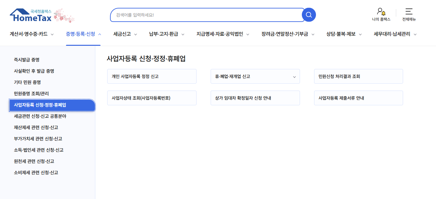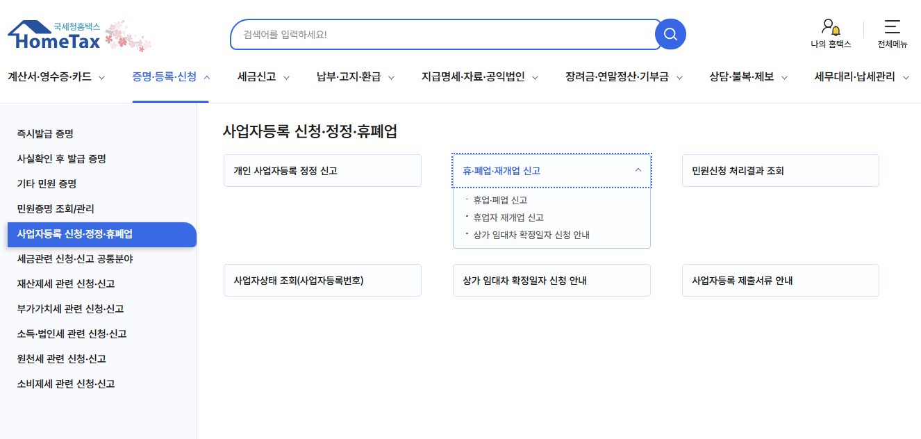 증명, 등록 신청 > 사업자등록 신청, 정정, 휴폐업 > 휴,폐업,재개업 신고