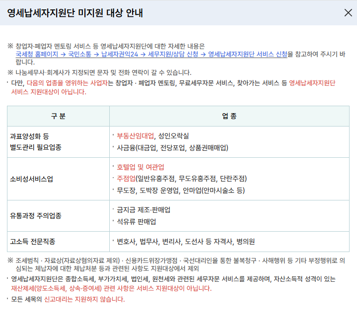 다만 다음의 업종을 영위하는 사업자는 창업자, 폐업자 멘토가, 무료세무자문 서비스, 찾아가는 서비스 등 영세납세자지원단 서비스 지원대상이 아닙니다.