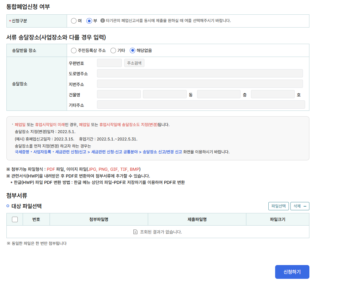 신청구분 '부' , 서류 송달장소 '해당 없음' , 신청하기 클릭
