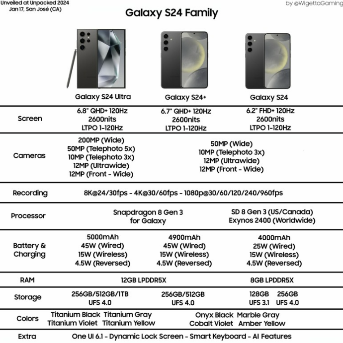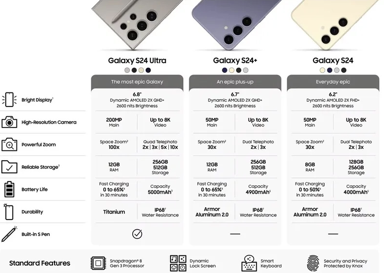 색상 옵션은 갤럭시 S24 울트라는 티타늄 블랙, 티타늄 그레이, 티타늄 바이올렛, 티타늄 옐로우 색상을 제공하며, 갤럭시 S24 및 갤럭시 S24 플러스는 오닉스 블랙, 마블 그레이, 앰버 옐로우, 코발트 바이올렛 색상을 제공합니다. 갤럭시 S24 울타라의 경우 새롭게 적용된 티타늄 소재의 프레임과 어우러져 고급스러움을 한층 끌어올렸을 것으로 기대합니다.