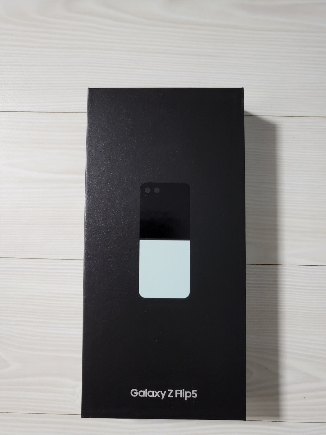 갤럭시 z플립5 민트 색상으로 구매했습니다. 사전예약으로 받은 핸드폰이며 포장을 뜯기 전에 앞, 뒤, 옆모습을 찍어봤습니다.