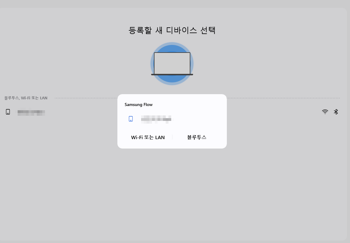 휴대전화나 태블릿에서 Samsung Flow를 열고 두 디바이스에서 블루투수를 켜거나 같은 WI-FI네트워크나 LAN에 연결하세요.