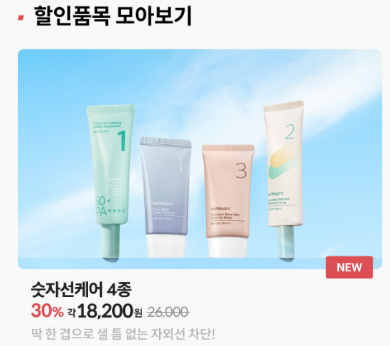 1번 청초 진정 맑은 물막 선크림, 2번 굿바이레드 그린더마 커버톤업 선크림, 3번 도자기결 파데스킨 톤업베이지 선크림, 1번 유리알 맑은 톤업클리어 선크림을 26,000원에서 18,200원으로 할인 판매 중입니다. 전부 30% 할인 판매 중이라서 여름이 다가오기 전에 준비하시면 좋을 것 같습니다.