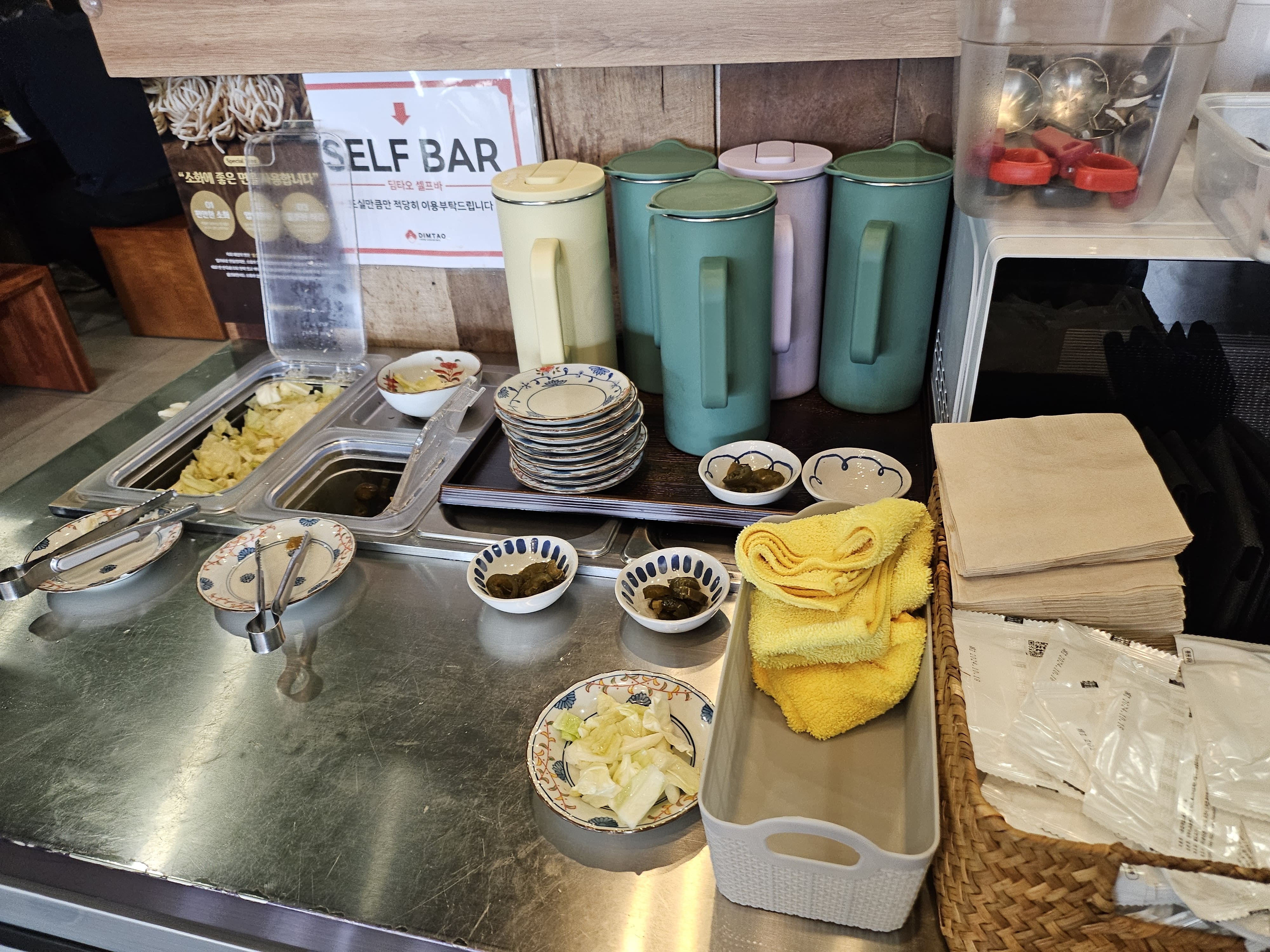 셀프바가 있어서 기본 반찬을 편하게 더 먹을 수 있습니다. 양배추도 담을 수 있고, 피클도 담을 수 있어서 취향 것 입맛에 맞게 더 드실 수 있습니다.