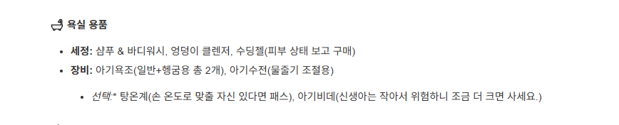 - 선택:* 탕온계(손 온도로 맞출 자신 있다면 패스), 아기비데(신생아는 작아서 위험하니 조금 더 크면 사세요.)