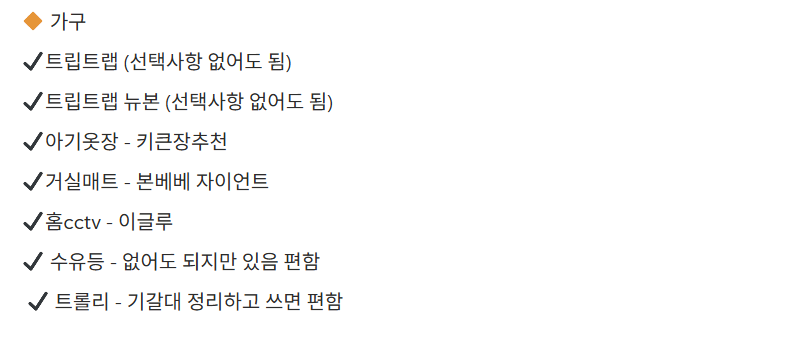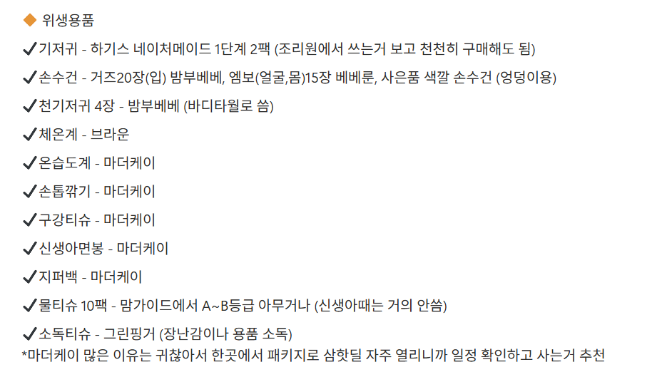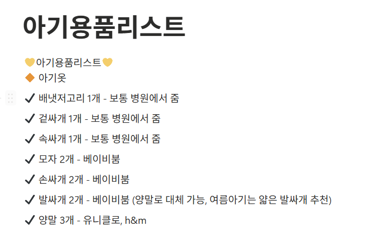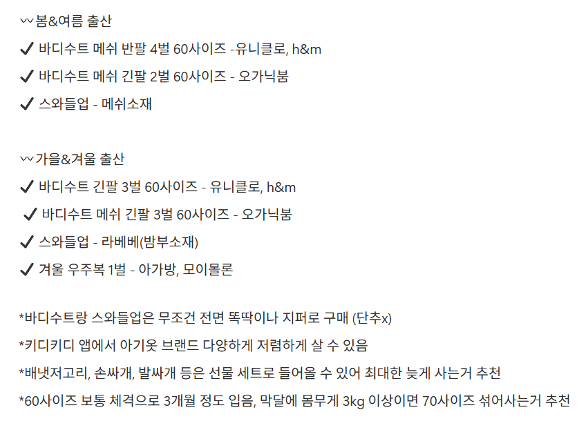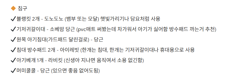 *배냇저고리, 손싸개, 발싸개 등은 선물 세트로 들어올 수 있어 최대한 늦게 사는거 추천