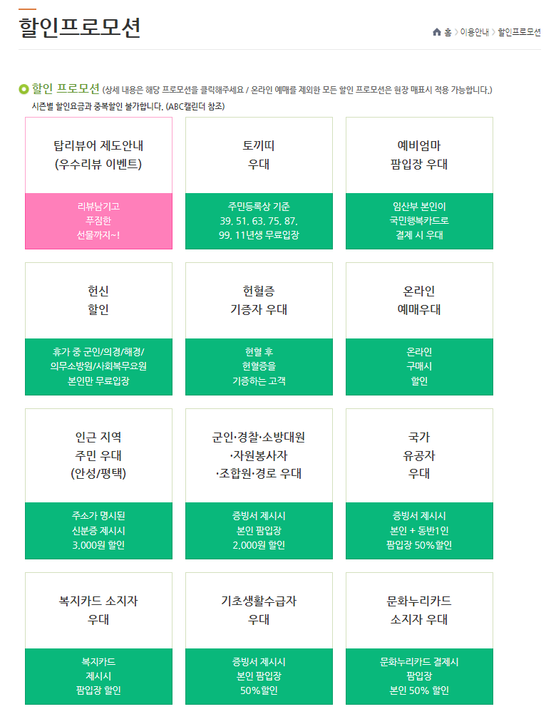또한 안성팜랜드에서는 토끼띠, 예비엄마, 헌신, 헌혈증, 온라인 예매 우대 등 다양한 할인 프로모션이 있어서 할인 정보를 알뜰하게 챙기시면 좋겠습니다.