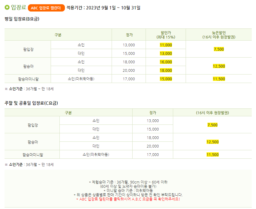 안성팜랜드 이용요금