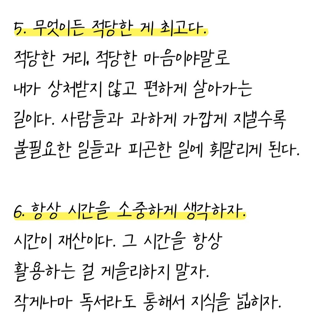 5. 무엇이든 적당한 게 최고다. 적당한 거리, 적당한 마음이야말로 내가 상처받지 않고 편하게 살아가는 길이다. 사람들과 과하게 가깝게 지낼수록 불필요한 일들과 피곤한 일에 휘말리게 된다.