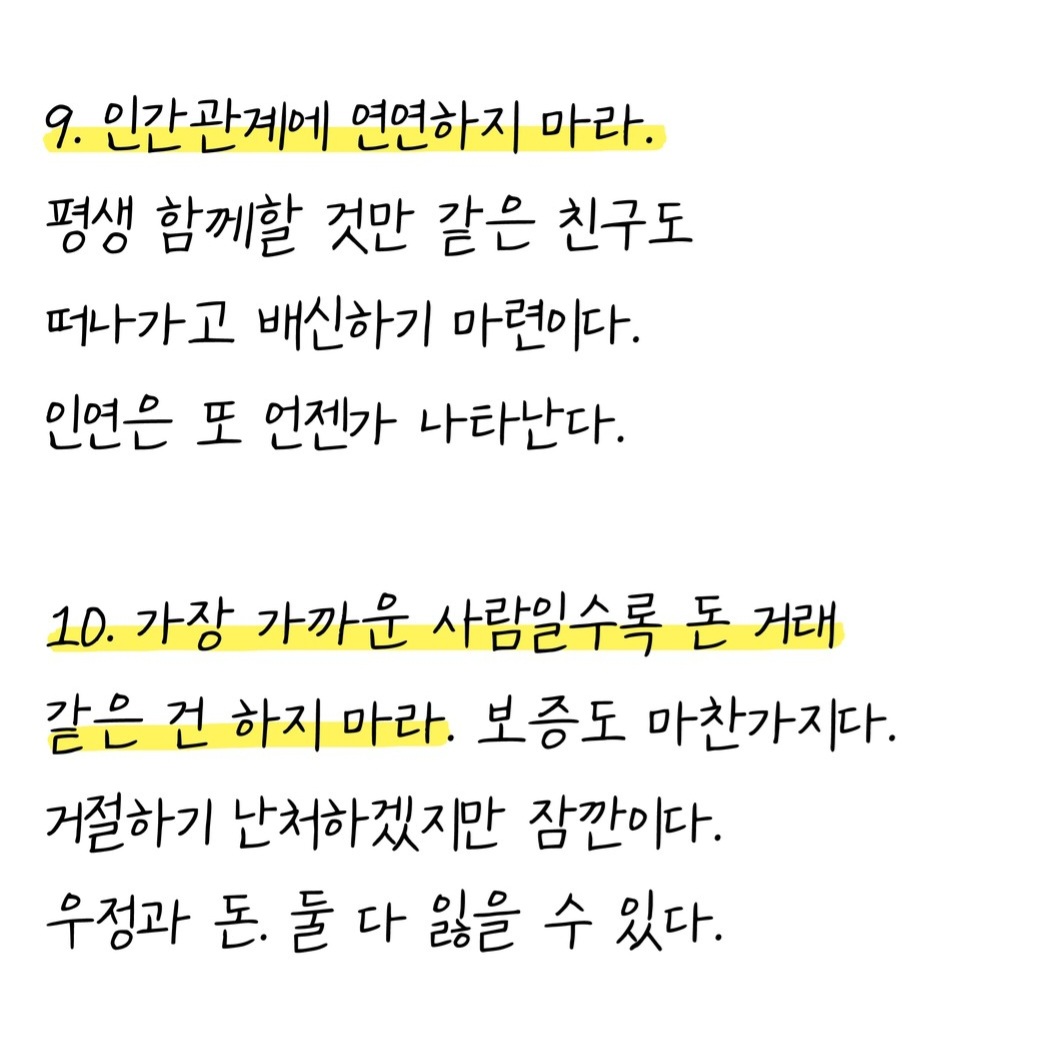 10. 가장 가까운 사람일수록 돈거래 같은 건 하지 말아라. 보증도 마찬가지다. 거절하기 난처하겠지만 잠깐이다. 우정과 돈 둘 다 잃을 수 있다.