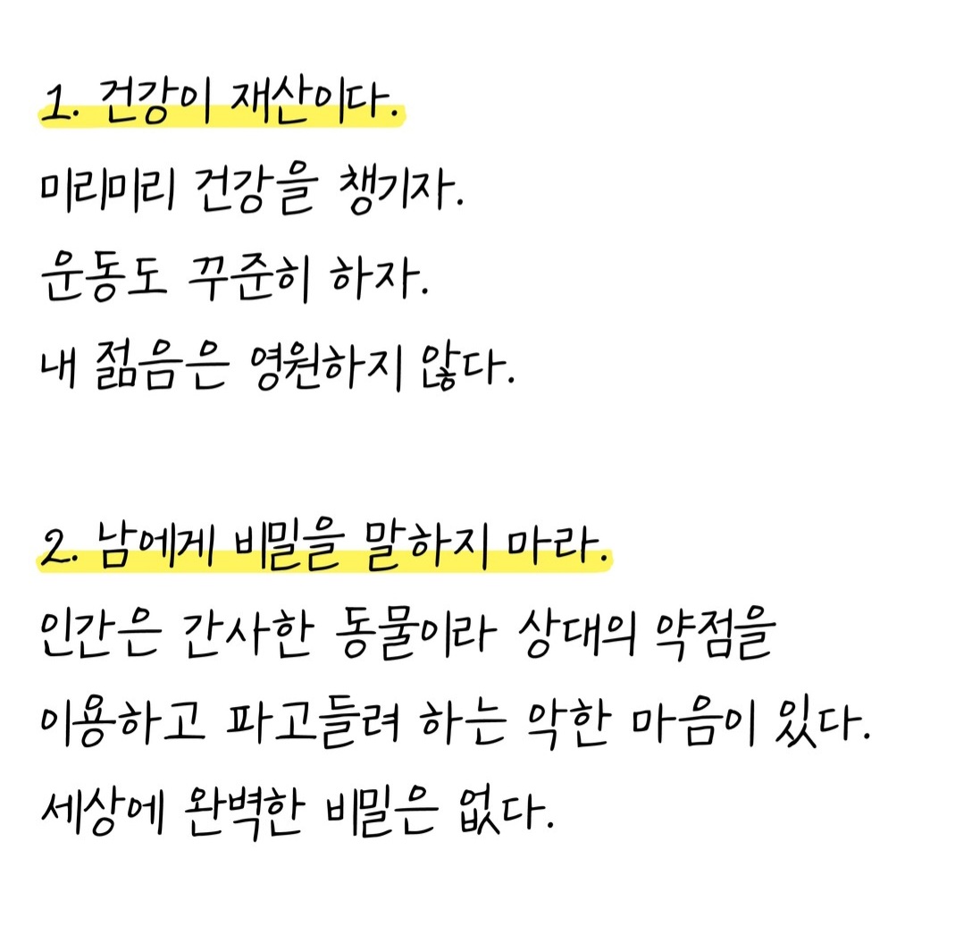 1. 건강이 재산이다. 미리미리 건강을 챙기자. 운동도 꾸준히 하자. 내 젊은은 영원하지 않다.