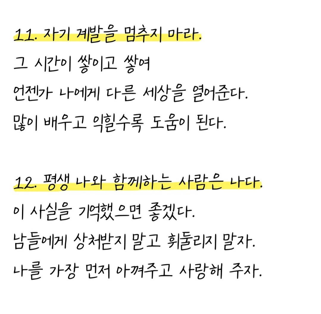11. 자기 계발을 멈추지 말아라. 그 시간이 쌓이도 쌓여 언젠가 나에게 다른 세상을 열어준다. 많이 배우고 익힐수록 도움이 된다.