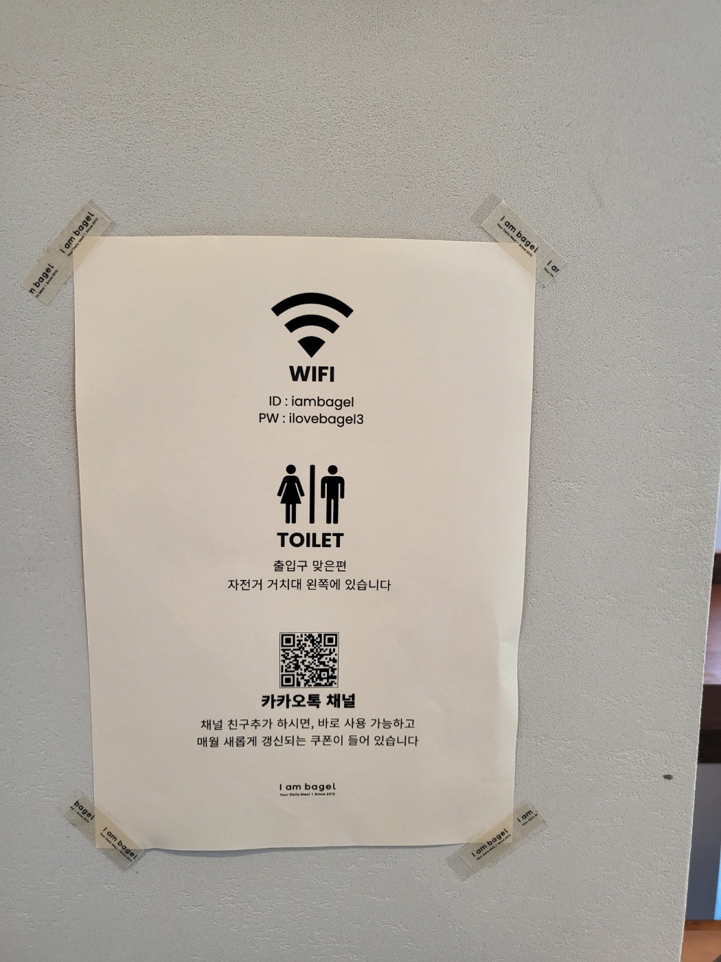 아이엠베이글 용산점 와이파이는 iambagel / ilovebagel3입니다. 화장실은 출입구 맞은편 자전거 거치대 왼쪽에 있습니다.