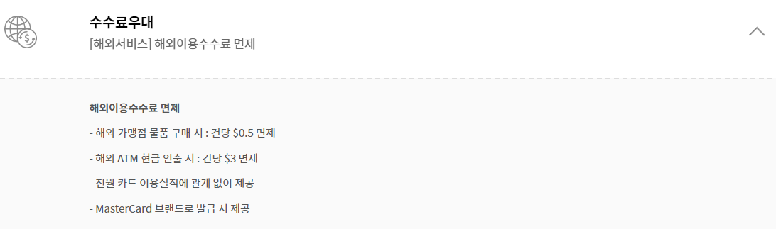 - 해외 가맹점 물품 구매 시 : 건당 $0.5 면제