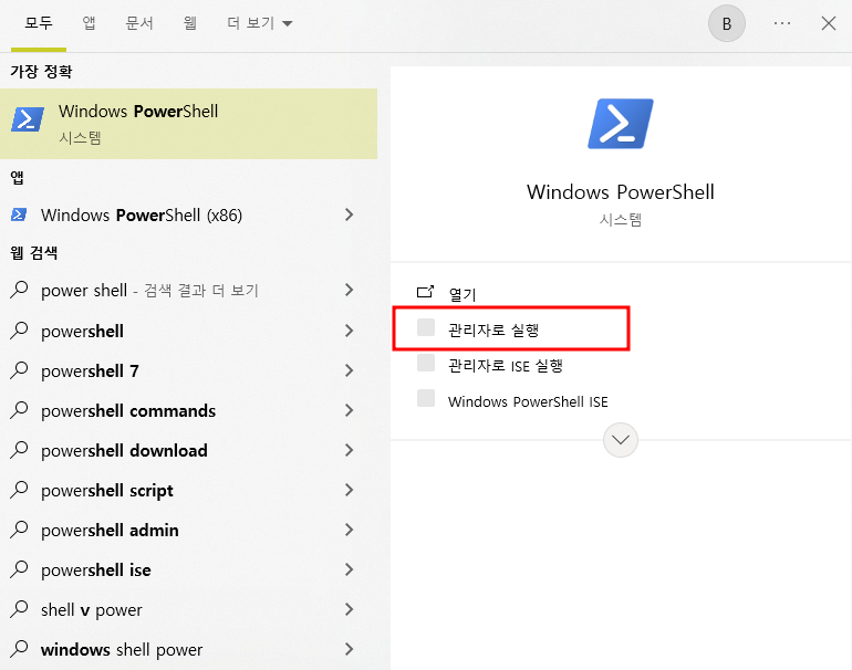 Windows PowerShell (관리자 권한으로 실행)을 엽니다.