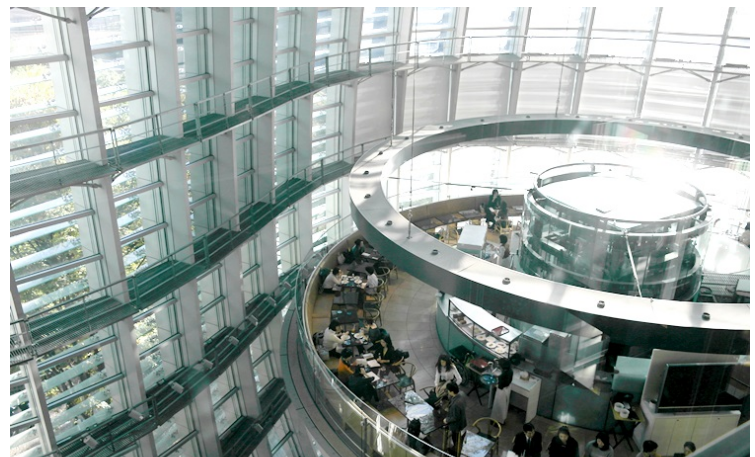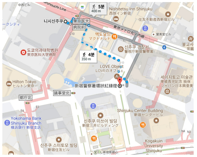 신주쿠 경찰서 뒤 교차로는 니시신주쿠 역에서 갈 수 있습니다. 이곳의 도로 위 거대한 원형 건축물이 눈에띕니다.