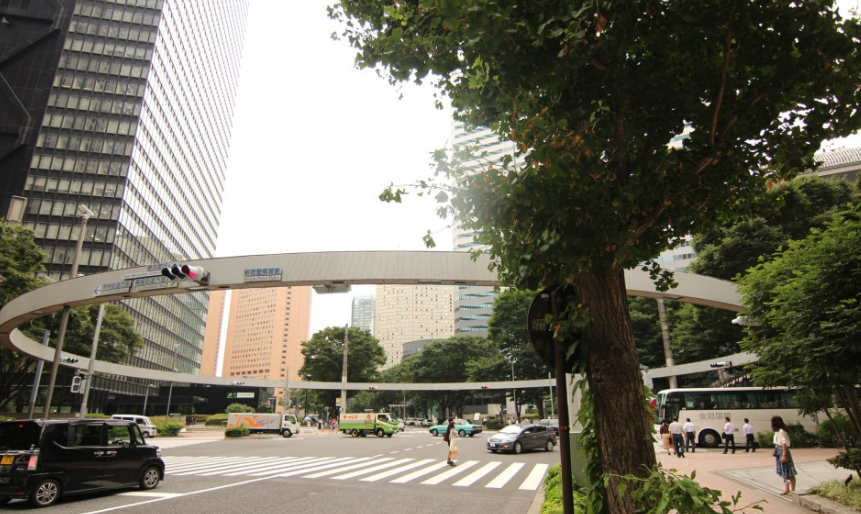 신주쿠 경찰서 뒤 교차로는 니시신주쿠 역에서 갈 수 있습니다. 이곳의 도로 위 거대한 원형 건축물이 눈에띕니다.
