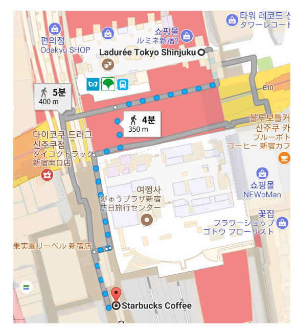 신주쿠역에 위치한 프랑스 마카롱 브랜드 매장입니다. 미츠하가 라뒤레 문 앞에 서서 구글 지도를 켜고 길을 검색하는 모습이 영화네 나왔었습니다.