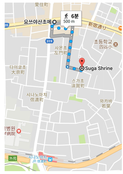 11무대 탐방을 결정한 뒤 머릿속에 가장 먼저 떠오른 장소가 있습니다. '너의 이름은.' 포스터에 나오는 계단입니다. 양옆으로 빨간 난간이 있습니다. 타키와 미츠하는 이곳에서 재회합니다. 이 계단은 스가 신사 근처에 있었습니다. 요쓰야산초메 역에서 내려 시나노마치 역 방향으로 걷다 왼쪽 골목으로 들어갔습니다. 채 10분도 걸리지 않았습니다.
