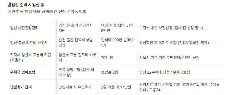 | 지자체 임산부 교통비 지원 (서울시) | 임산부 교통·철도비 바우처 | 70만 원 | 서울시 거주 기준 주민센터/온라인 신청 |