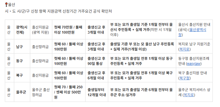 | 울산 | 울주군 | 울주군 출산장려금 | 첫째 70 / 둘째 250 / 셋째 이상 500만원 | 출생일부터 12개월 이내 | 부 또는 모가 출생일 기준 6개월 전부터 울주군 주소·실거주 | 울주군 복지서비스 상세 (복지로) |
